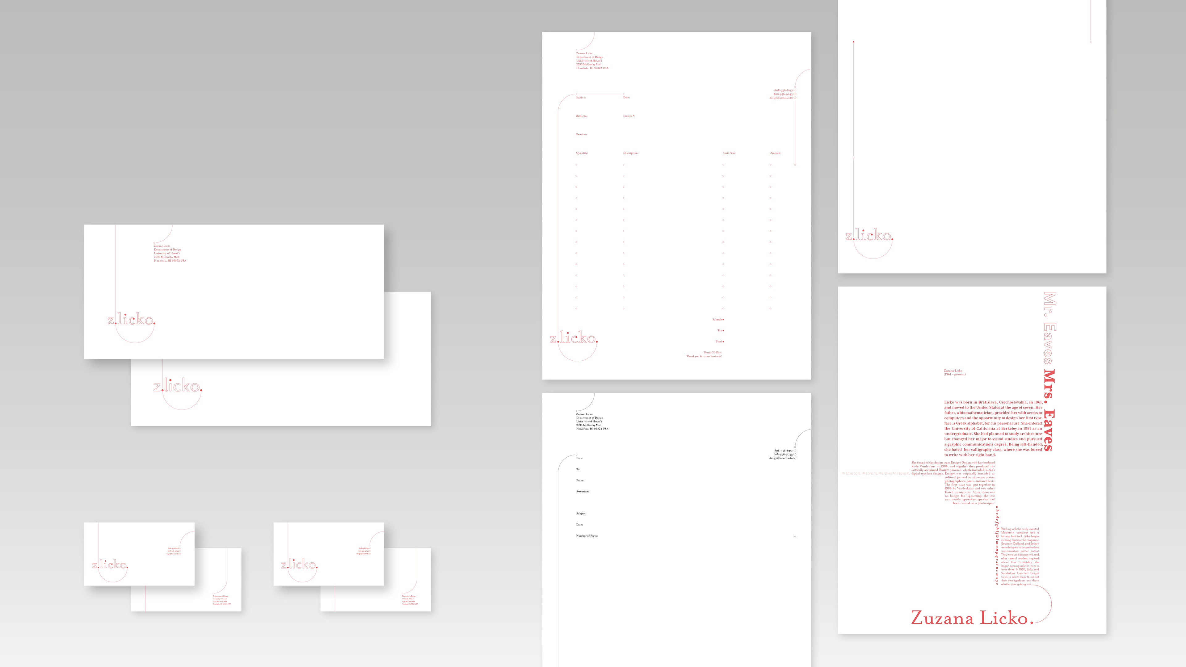 Set of stationery inspired by Zuzana Licko's fonts Mr Eaves and Mrs Eaves. Includes identity, business card, envelope, letterhead, invoice, etc.